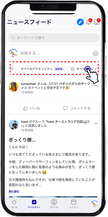 - グループの投稿:参加中のグループの投稿に絞れます。